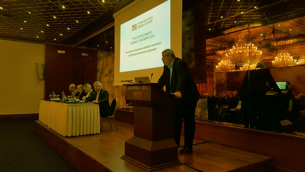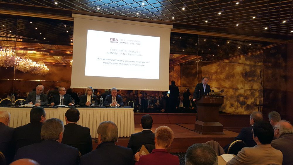 Χαιρετισμός και παρέμβαση έγινε από τον Πρόεδρο της Κεντρικής Ένωσης Δήμων Ελλάδας, κ. Γιώργο Πατούλη, μέσω SKYPE, ο οποίος, τονίζοντας την ανάγκη διαμόρφωσης κοινής στρατηγικής για την Αυτοδιοίκηση, κάλεσε όλους τους αιρετούς να συμμετάσχουν στο Συνέδριο της ΚΕΔΕ που θα πραγματοποιηθεί 1-3 Δεκεμβρίου 2016, στην Θεσσαλονίκη.